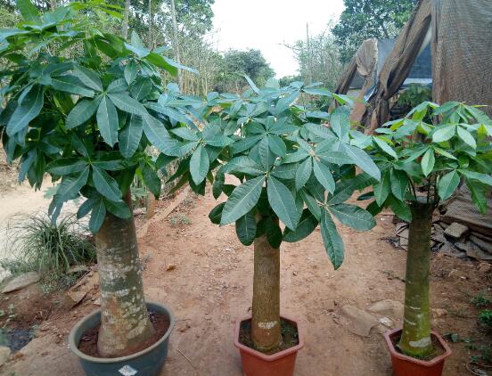 发财树株高4-5米,树冠较松散,幼枝栗褐色。中央小叶长13-24厘米,宽4.5-8厘米,外侧小叶渐小。叶柄长11-15厘米,花单生枝顶叶腋;花梗粗壮,长2厘米。花期5-11月,果先后成熟。