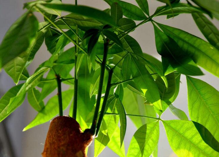 发财树叶片扦插扦插时间可在3-10月间进行,从母株上剪取一段长10厘米健康半木质花化枝条,在消毒晾干后扦插进准备好基质中。..