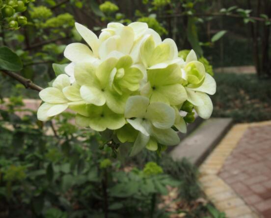 绣球为伞房状聚伞花序近球形,直径为8-20厘米,花萼长为1.4-2.4厘米,宽为1-2.4厘米,颜色为粉红、淡蓝、白色等。花梗长为2-4毫米。花瓣形为长圆形,长3-3.5毫米。花药长圆形,长约1毫米。花期是在每年的6-8月。