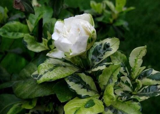 斑叶栀子与其他品种的栀子花最大的不同点就体现在它的叶片上,其他品种的栀子花叶片大多都是绿色的,但它的叶片上带有斑纹,远观特别像一片片黄绿相间的花朵,花朵的味道清香,很好闻。